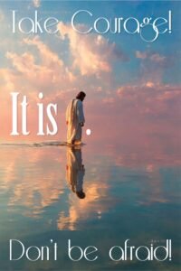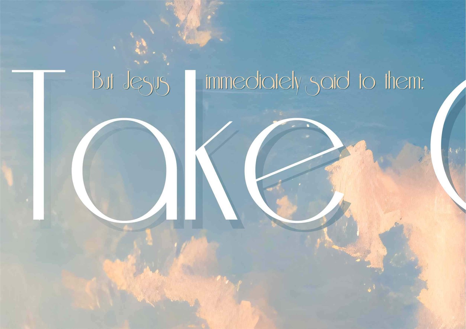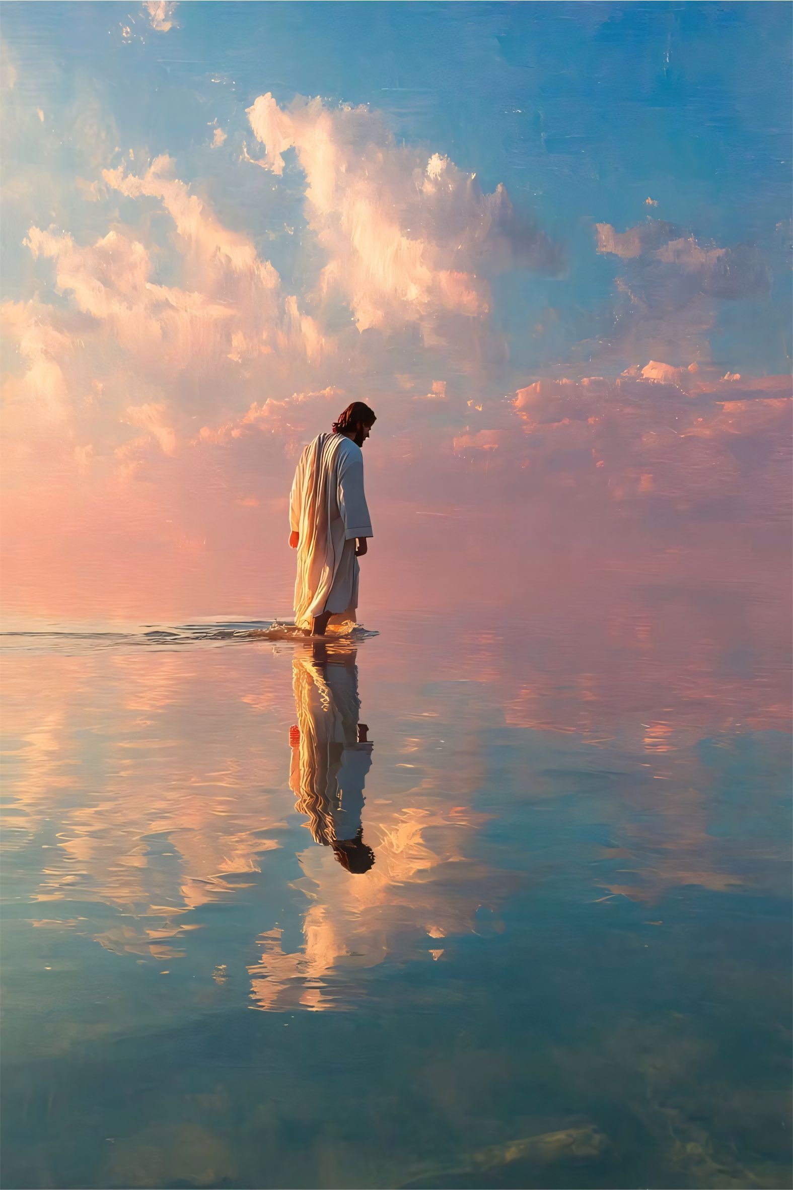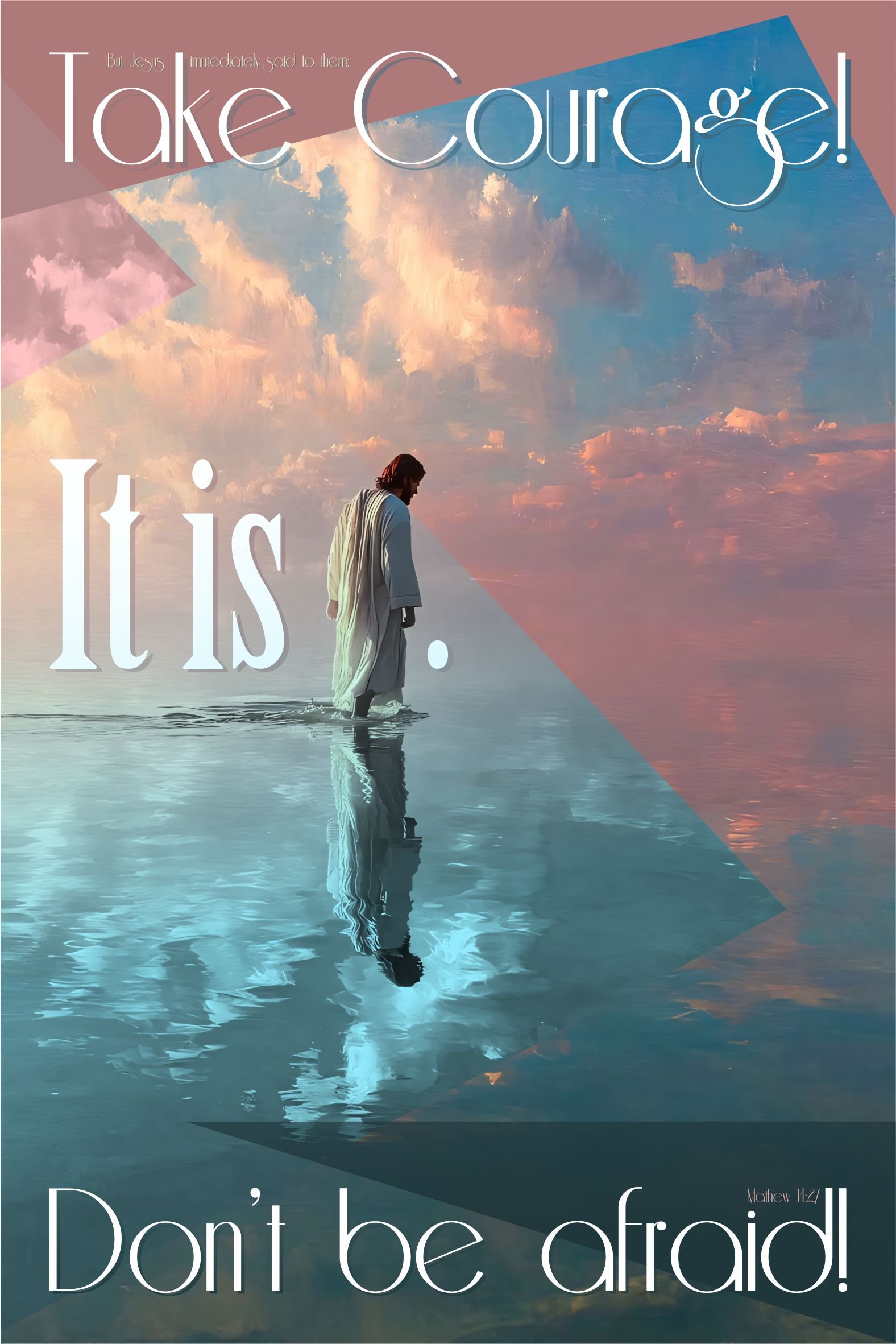 This vertical shot of Jesus walking on water chooses Mathew 14:27 by default but you can order a custom design with your favorite scripture.